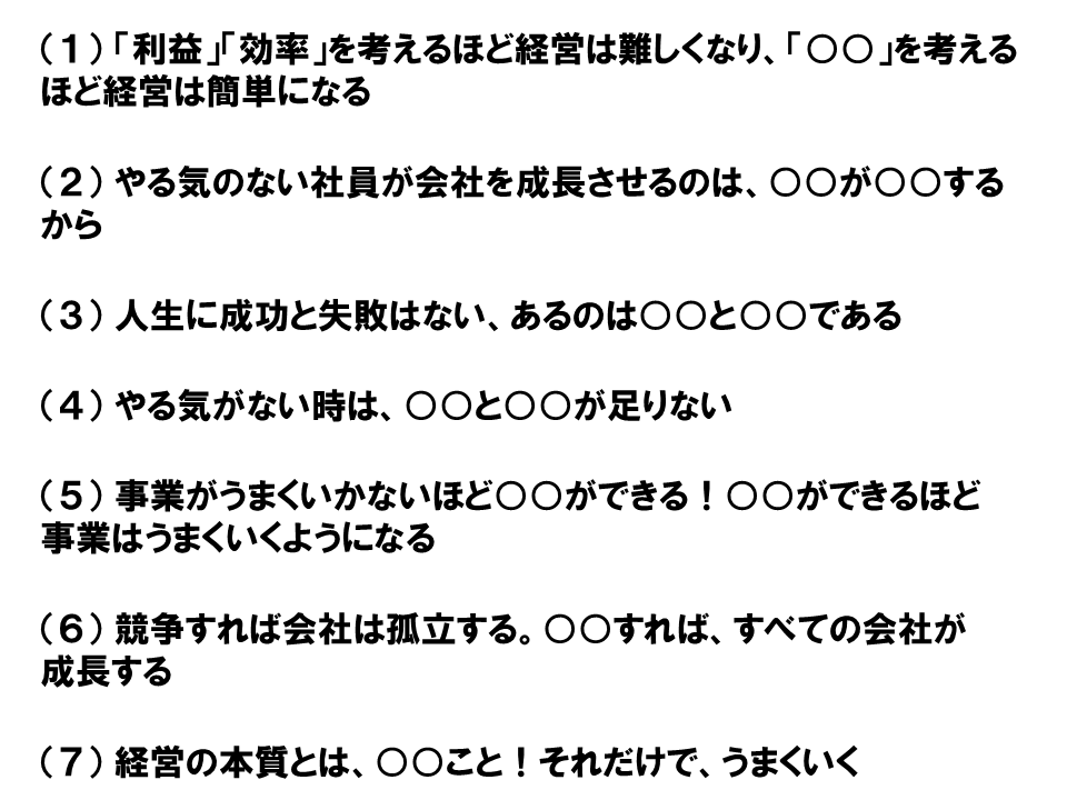 いかなる問題が起きようとも、すべての社員が自己責任で考え、いかなる困難をも乗り越えていく企業が、最も強い企業です。誰もやりたがらないことを、自分の出番と思ってやる社員が多いほど、企業はより強くなり、誰でもできることしかやらない社員が多いほど企業は弱くなっていきます。